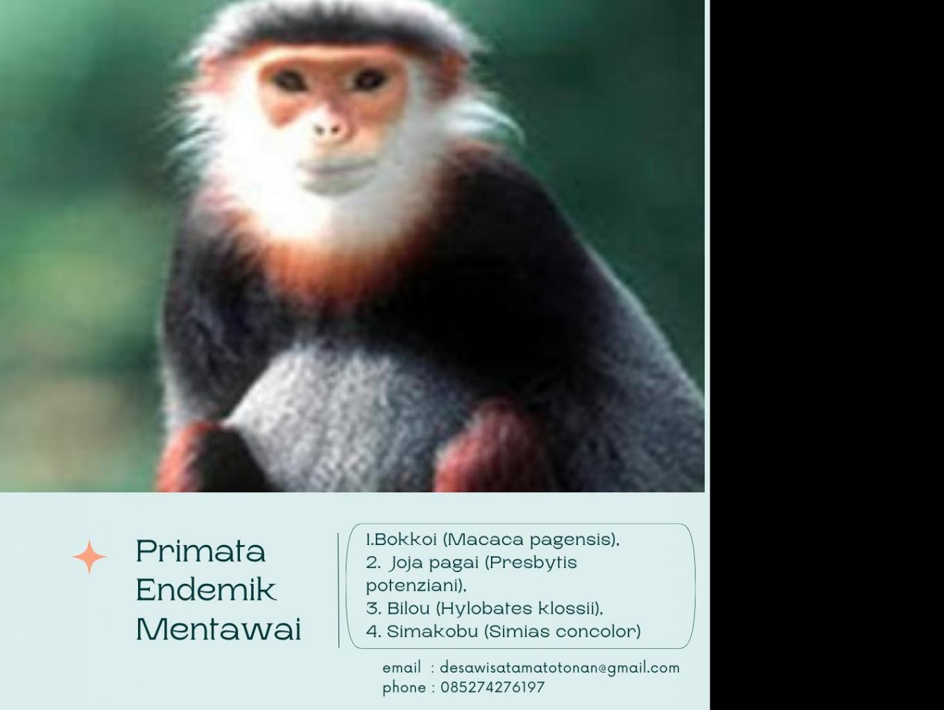 Empat primata endemik Mentawai diPulau Sipora, Kepulauan Mentawai, Sumatera Barat kini semakin terancam kehilangan habitatnya. Keempat primata itu adalah Bokkoi (Macaca pagensis), Joja pagai (Presbytis potenziani), Bilou (Hylobates klossii), dan Simakobu (Simias concolor) .
